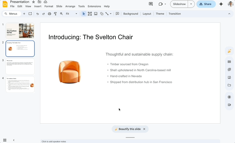 还可以升级美化原本简约的PPT页面,就像这款小沙发椅,从原料、生产到运输的全流程,它可以自动在地图上清晰标示说明: