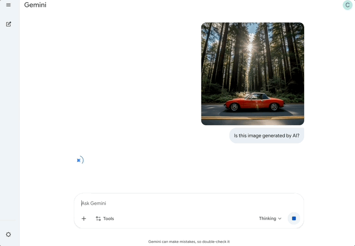 用户可通过上传图像并提问“这是AI生成的吗?”,确认其是否由谷歌AI生成或编辑。