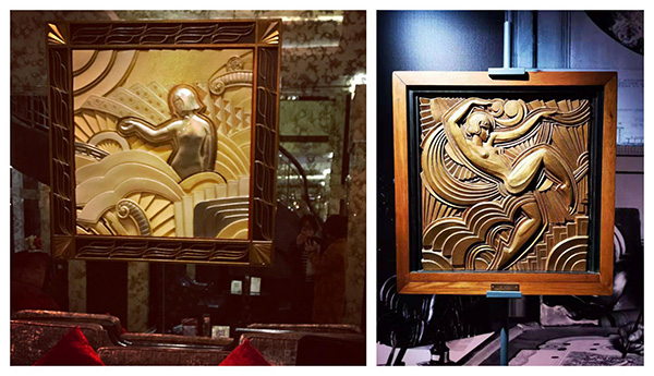 进入内部,天顶和地面呼应的地毯、通往二层的回旋扶梯,抬头便可见的巨大彩色穹顶……都是Art Deco 的印记。在二楼咖啡吧廊道墙面上,摆放着数幅镀金石膏。这时俞一君点开了手机图册,“这是我的一位香港朋友Eric在3月初去城市大学展览馆看《装饰艺术: 当法国与中国交汇》展览时同步发我的一张,你看,像不像”,我点了点头,她接着说,“香港展出的是1928年Maurice Picaud的名作,‘女神游乐厅’的原作,是Art Deco历史上很重要的标志作品,但好在我们眼前就能看到它的‘后代’,所谓时光易逝,风格永存,也是这个道理”。