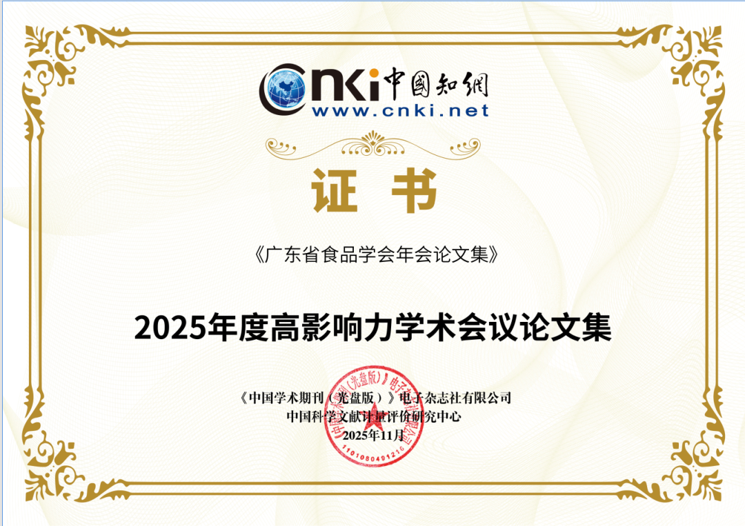 11月6日,在山西太原举办的“学(协)会高质量发展论坛暨2025年度高影响力学术会议论文集发布会”上中国知网·中国科学文献计量评价研究中心正式发布《高影响力学术会议论文集评价报告(2025)》。广东省食品学会编制的年会论文集继2024年后又一次成功入选2025年度“高影响力学术会议论文集”名单,在全国性权威学术评价中脱颖而出。