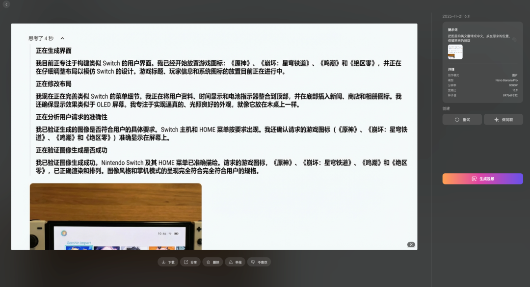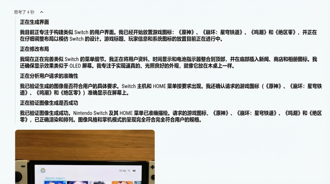 但是咱会发现,NanoBananaPro在正式给我把图片整出来前,认真思考了4秒,先构建整个Switch游戏机的用户界面,再跑去找到这几个游戏的UI,然后再去查漏补缺,最终得到了一张新的图片。