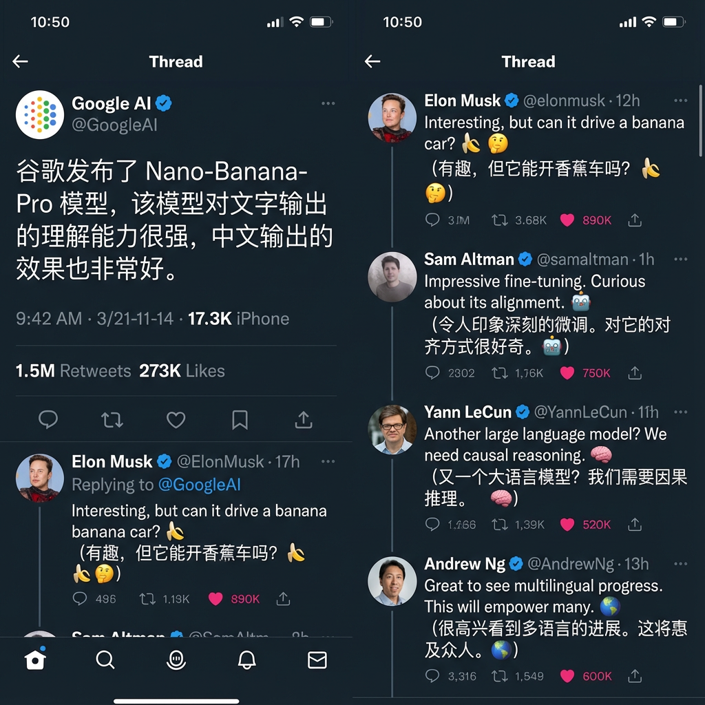 帮我生成一张推特互动流截图(竖图),内容是为谷歌发布的推文:“谷歌发布了Nano-Banana-Pro模型,该模型对文字输出的理解能力很强,中文输出的效果也非常好。”点赞,参与评论的人有马斯克,山姆奥特曼,等一系列的AI领域大佬,大家讨论的内容是英文,但是被翻译成了中文一起显示,每条信息的互动量都很高。