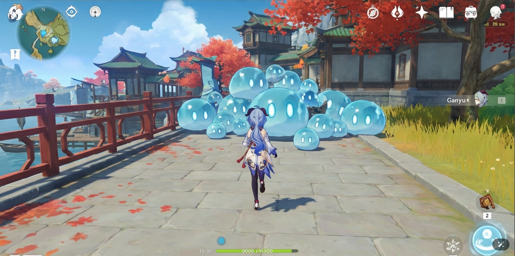 一张原神的游戏截图,在璃月的城市边上,玩的角色是甘雨在赶路,前面出现了15个冰属性的史莱姆。