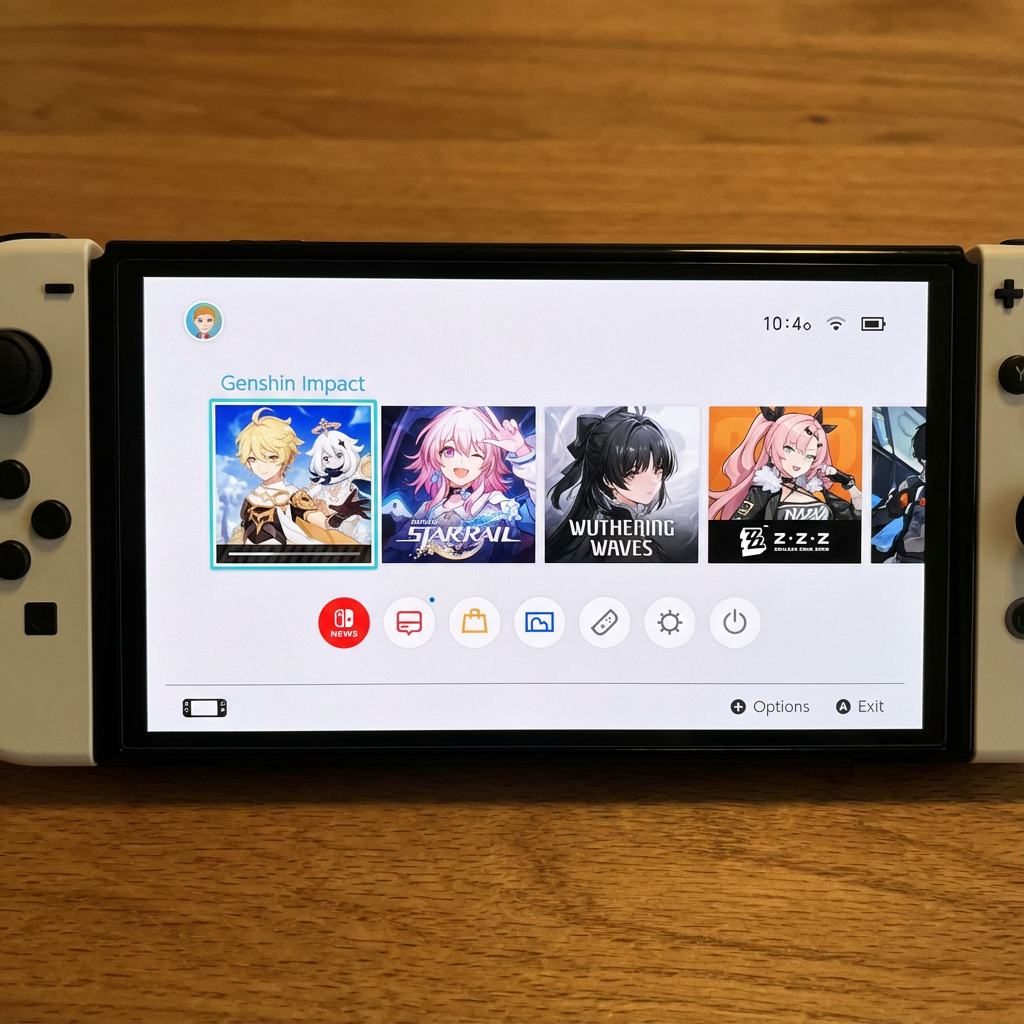 生成一个NS主机的菜单栏主界面,能选择游玩的游戏分别是原神,崩坏:星穹铁道、鸣潮、绝区零。
