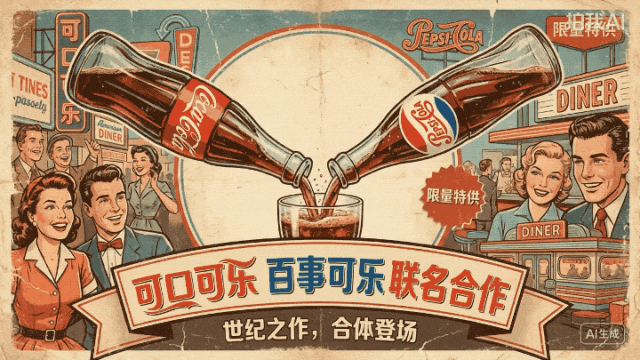 制作一张可口可乐和百事可乐联名宣传产品的横幅海报,要求用中文,整个海报要有复古元素