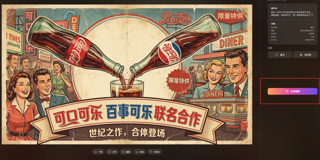 让它给我画一张百事可乐和可口可乐的联名海报,也是可以轻松拿下。