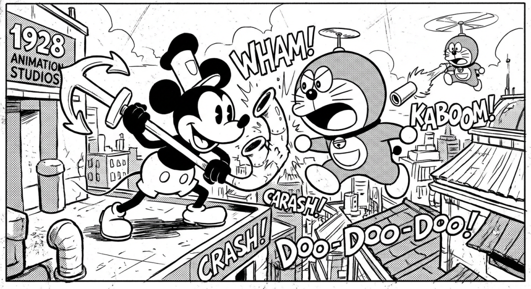 就比如这儿,我让它来生成一张米老鼠大战多啦A梦的漫画。