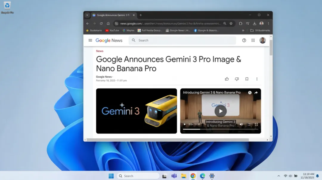 帮我生成一张Windows11的电脑截屏,桌面和背景一切正常,屏幕中间打开了一个Chrome浏览器,上面正在播放谷歌发布了gemini3的新闻,左下角的时间是2025年11月18日