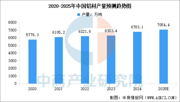 铝加工材是将电解铝或铝合金通过轧制、挤压、拉伸和锻造等塑性加工方法加工成各种形状和规格的铝制品,如板材、带材、箔材、管材、棒材、型材、线材和锻件等,广泛应用于建筑、交通运输、电子、包装等领域,是铝产业链的终端产品。中商产业研究院发布的《2025-2030年中国铝行业深度挖掘及投资决策分析报告》显示,2024年中国铝材产量达到6783.1万吨,较上年增长7.61%。中商产业研究院分析师预测,2025年全年中国铝材产量将达到7054.4万吨。