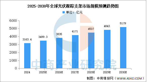 跟踪支架较固定支架可提升15%-40%的发电效率,尤其在大型地面电站中,其高效发电、低度电成本的优势更为显著,成为众多光伏项目的首选方案。中商产业研究院发布的《2025-2030年中国光伏支架市场调查与行业前景预测专题研究报告》显示,2024年全球光伏跟踪支架市场规模约3163.1亿元。中商产业研究院分析师预测,2025年全球光伏跟踪支架将继续增长到3499.3亿元,到2030年有望超过5000亿元。
