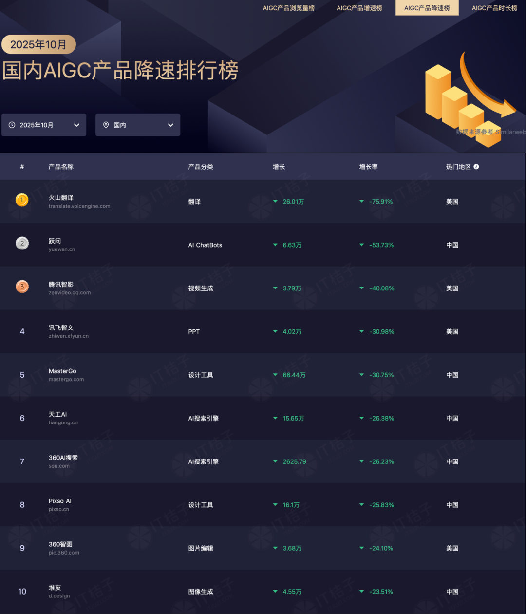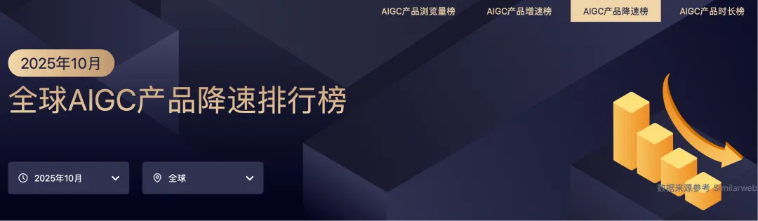 2025年10月全球AIGC产品降速榜单显示,中美产品占据绝对主导且降幅显著