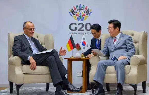 22日,默茨与李在明在南非G20峰会期间会晤韩媒