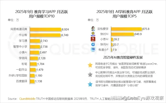 其中,2025年9月AI学科教育APP月活跃用户规模TOP5分别为豆包爱学、快对AI、小思AI、快问AI和有道小P,其中,豆包爱学和快对AI月活分别为875.8万和646.9万,处在行业第一梯队。