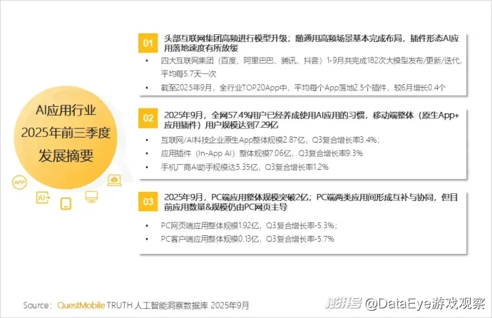 另一方面,2025年9月,全网57.4%的用户已经养成了使用AI应用的习惯,移动端整体(原生APP+应用插件)用户规模达7.29亿。