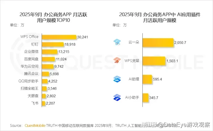 其中,2025年9月办公商务APP中AI应用插件月活跃用户规模,云一朵达2050.7万,WPS灵犀达1503.1万,AI助理和AI小助手分别为595.4万和345.7万。