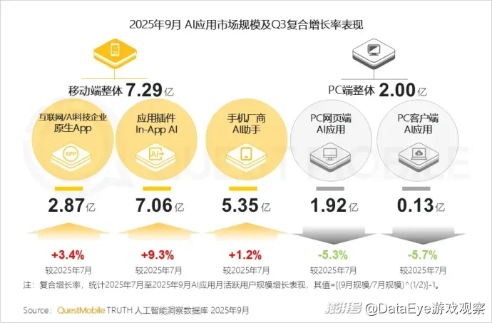 其中,互联网/AI科技企业原生APP整体规模达2.87亿,Q3复合增长率3.4%;应用插件整体规模7.06亿,Q3复合增长率9.3%;手机厂商AI助手规模5.35亿,Q3复合增长率1.2%。