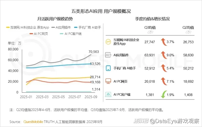 QuestMobile数据显示,2025Q3,AI应用插件月均活跃用户规模6.39亿,相较Q2增长9.0%。