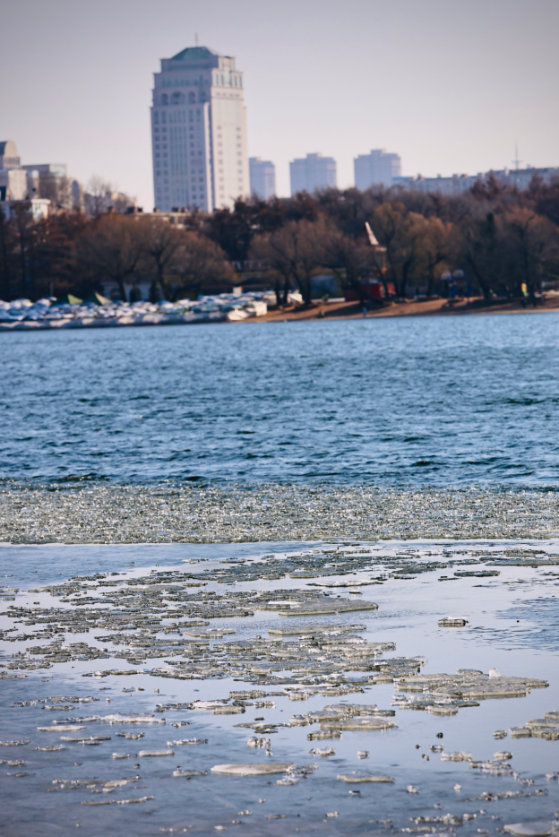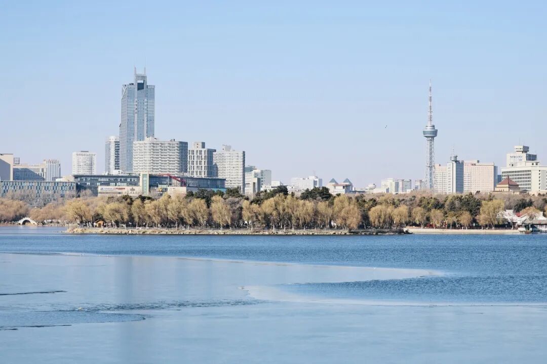 南湖长堤、金沙滩边。放眼望去,湖面冰封初成,约六分冰镜已铺开,其间偶见龙鳞状的冰纹隐现,与未封冻的碧波相映成趣。