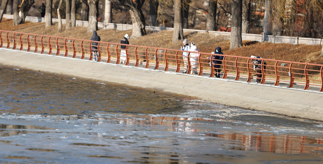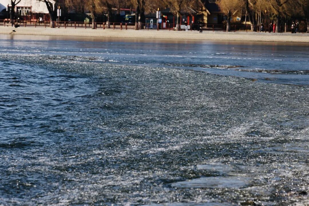 冬阳轻洒时,冰面折射出细碎晶莹的光芒。三五游人聚在岸边,或欣赏冰纹,或拍摄留影,笑语声中满是对北国冬日的期待。