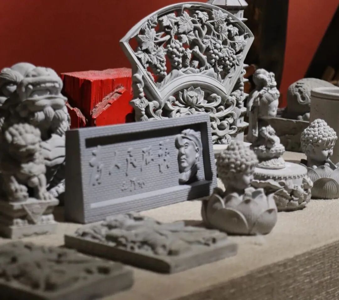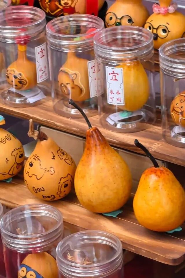 古城文创店将木版年画的辰砂红、泥塑的石膏白、鸭梨葫芦的鹅黄封存在琉璃瓶中。