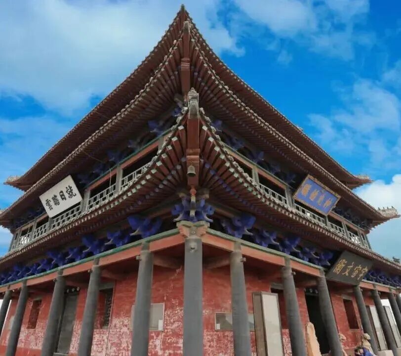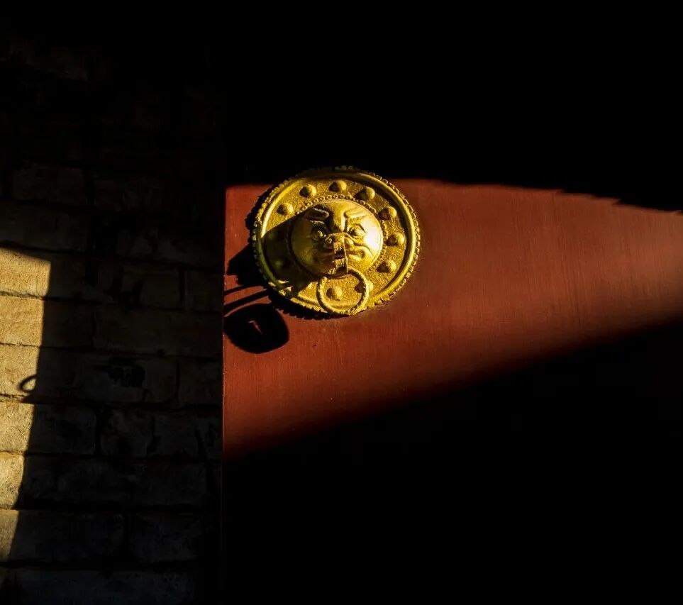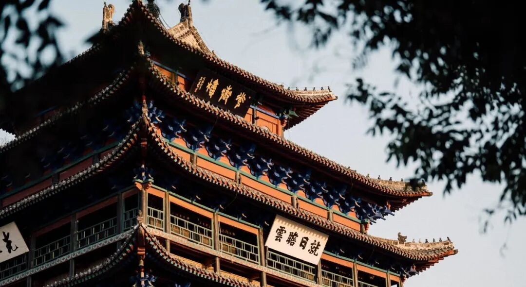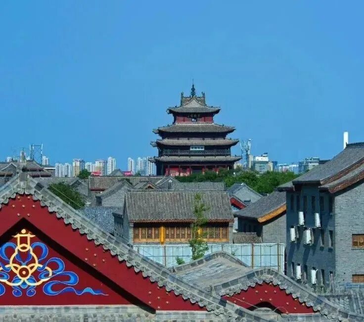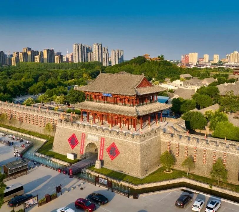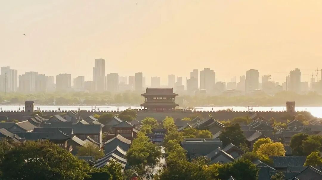 阳光下,古建筑朱红的门扉和灰色的砖瓦格外醒目。俯瞰城区,街道上流动的车灯与万家灯火透出的橘色光芒相互交织。