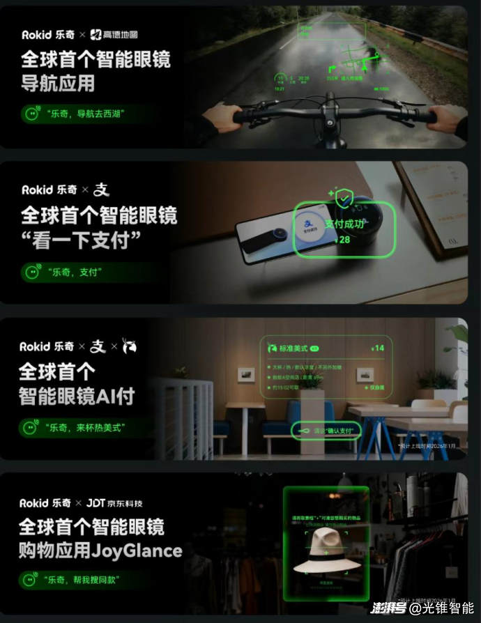 转到2025年的发布会时,Rokid在今年11月与BOLON合作的Rokid Glasses上,对C端消费场景功能做了更精细的打磨。例如与高德合作提供导航功能;与支付宝合作声纹支付;与京东科技合作推出“看一下搜同款购物”;与QQ音乐合作推出智能眼镜专属音乐体验等功能。