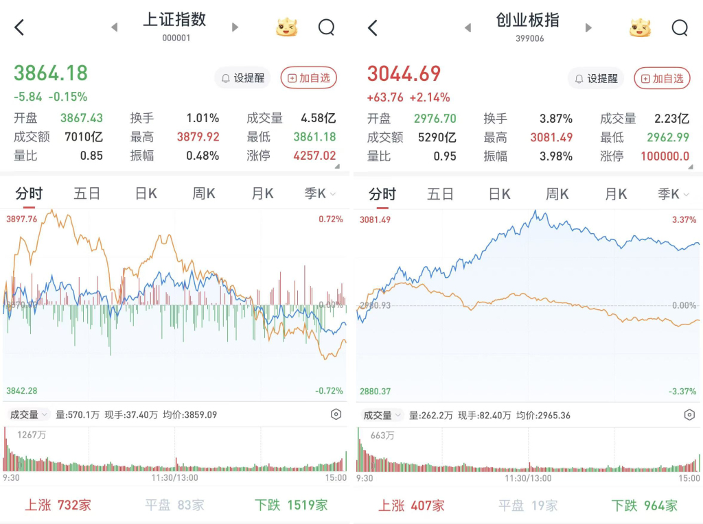 至收盘,上证综指跌0.15%,报3864.18点;科创50指数涨0.99%,报1315.04点;深证成指涨1.02%,报12907.83点;创业板指涨2.14%,报3044.69点。