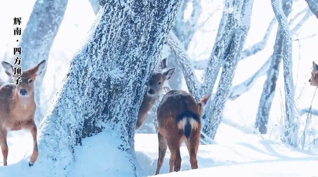 冬日里,当你登上四方顶,眼前展现的是一个白茫茫的童话世界。晶莹剔透的玉树琼花挂满枝头,古树在积雪的包裹下展现着千姿百态。在这片遗落人间的童话仙境中,感受巍峨挺拔的古树迎风而立,体悟婀娜多情的雪花翩跹起舞,你能感知到生命别样的精彩。更有灵性的是,在这银装素裹的雾凇林间,还有活泼可爱的梅花鹿如精灵般跳跃,为这静谧的世界增添了几分生机与活力。