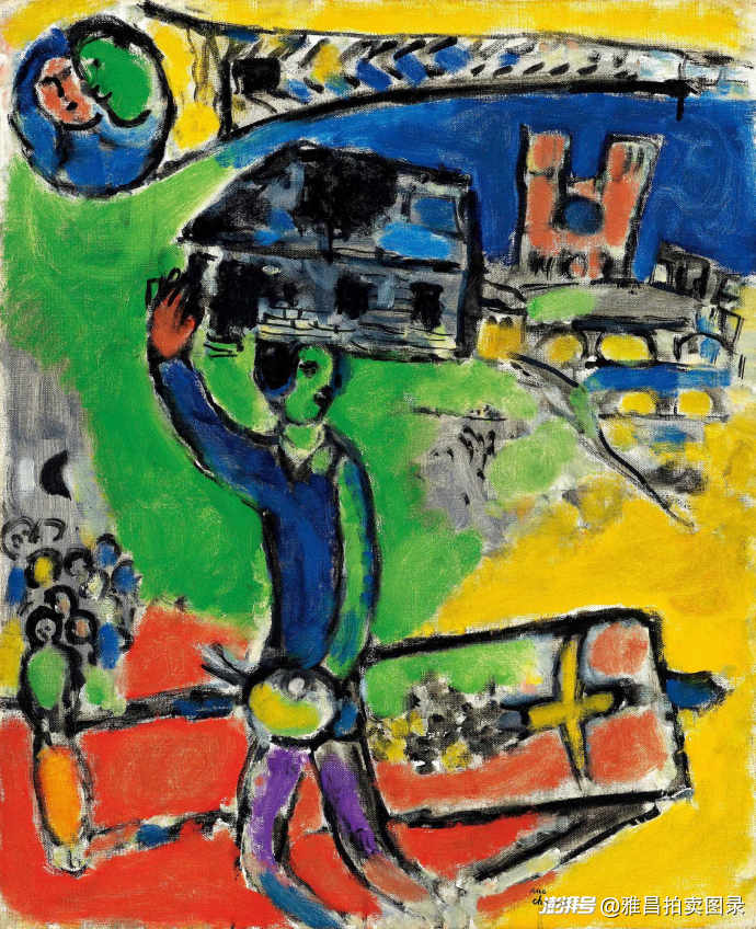 夏加尔自传性杰作《我的家园》以775.5万港元成交,该作于过去逾50年来由艺术家及其家属珍藏。作品大胆使用高饱和度的原色,在画作中心,可见艺术家现实生活中标志性的卷发、拉长身体的人物,左手持调色盘,右手高举若向观众打招呼,欢迎我们进入艺术家的世界。画面左上一轮蓝月中两个亲昵相贴的脸庞,正是画家与其妻子写意的形象,一红一绿的脸庞,宛若火焰与原野,感性与理性,在满月的天空中彼此相守,流露了艺术家彼时幸福的家庭生活。作品打破了传统透视、单一时空与重力法则,画中的人与物在多维时空中自由伸展,一个结合现实、回忆、想像与梦境,一个艺术家毕生所爱、充满活力的世界,在我们眼前展开。