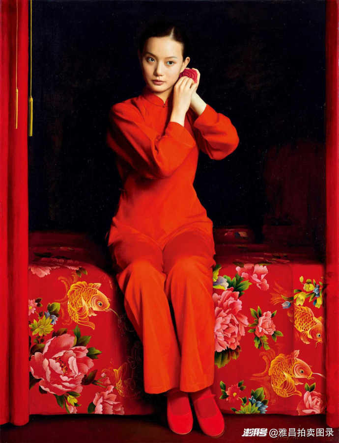 王沂东《新娘》以175万港元落槌,210万港元成交。本作主角端坐婚床,双手轻扶乌发间的红花,双腿含蓄地并拢,微微颔首,凝神含羞,尽显东方女性的温婉与内敛。艺术家以其标志性的“中国红”贯穿画面:女子的嫁衣、花饰,至婚床与帘幕,无不施以饱满绚烂而富有层次的朱砂色,既成为其作品的视觉核心与个人标记,更唤起观者对中国源远历史文化之怀想,赋予作品深切的民族情感。深蕴艺术家对九十年代乡土精神的眷恋——在城市化浪潮初袭之际,竭力留存传统农业社会真纯、简朴的温情。