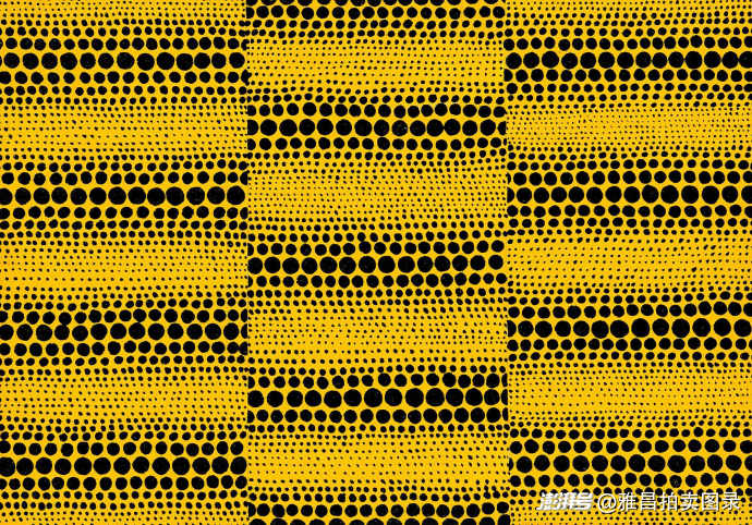 草间弥生完成于1990年的《河》现场以144万港元成交。本作以草间弥生标志性的圆点与摄人的黑黄配色,碰撞出强烈的视觉张力。艺术家将其广为人知的南瓜主题和“无限网”的概念结合,呈现出其于80年代初创生的“压平式南瓜条纹图案”。透过平面化的处理,她巧妙地消解了起点和终点的界限,令南瓜的形态不再具象,而是彻底融于波点之中,成为无限的一部分,喻示个体在宇宙中的流动与融合。