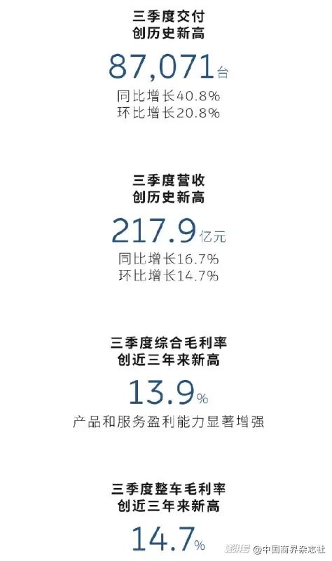 蔚来汽车最新发布的2025年第三季度财报显示,汽车交付量达8.71万辆,同比增长40.8%;营收达217.9亿元,同比增长16.7%;综合毛利率提升至13.9%,创近3年新高。引人关注的是,蔚来创始人、董事长李斌表示,公司有信心在今年四季度实现盈利。