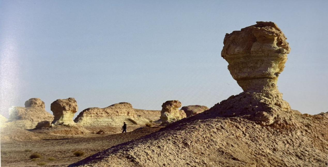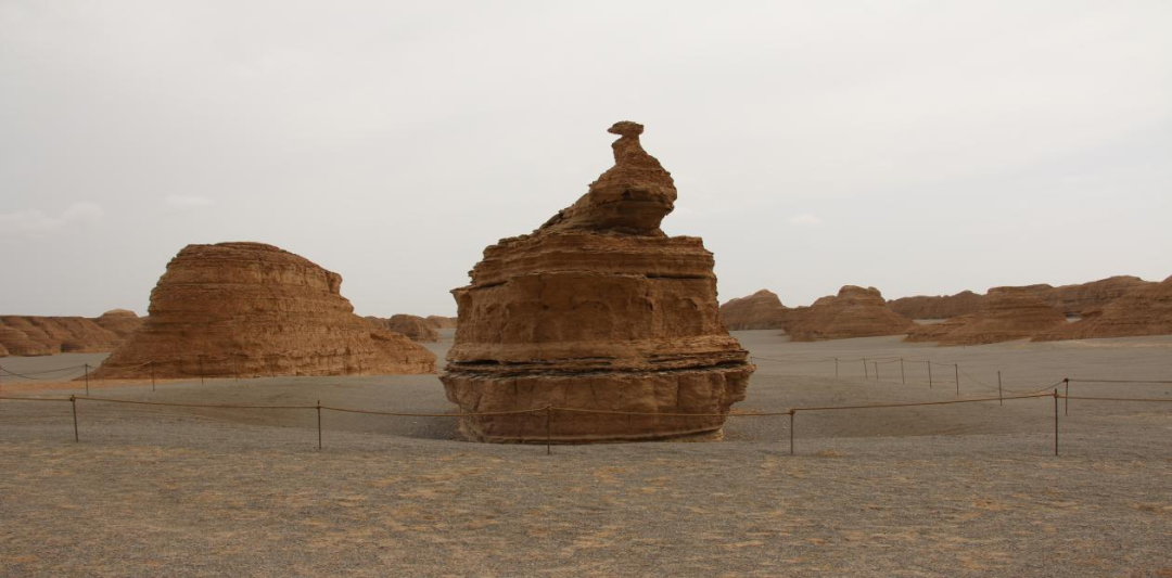 风蚀蘑菇:下部泥岩(抗蚀弱)被优先侵蚀变细,上部砂岩(抗蚀强)留存,形成上大下小的蘑菇状结构。