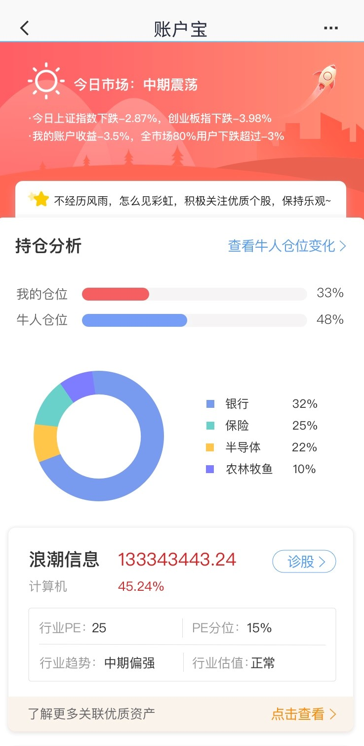 在账户宝页面,投资者不仅能实时查看自身收益情况与市场行情解读,还能通过“仓位对比”功能,将自己的仓位曲线与“牛人仓位”对标。陈先生正是通过这一功能发现,在市场高波动时段,牛人账户会主动减仓,而在低位逐步加仓,反观自己的仓位曲线几乎是一条直线,常年高企的仓位让账户暴露在过度风险中。进一步查看持仓结构分析,系统清晰呈现了他的行业分布、个股盈亏状况,甚至精准标记出“需优化标的”:两只长期持有的科技股,虽属于熟悉赛道,但财务指标稳定性不足、ROE偏低,是拉高新账户波动率的主要原因。“原来不是赛道选错了,而是赛道里的‘选手’和‘队形’出了问题。”数据化的呈现让陈先生豁然开朗。