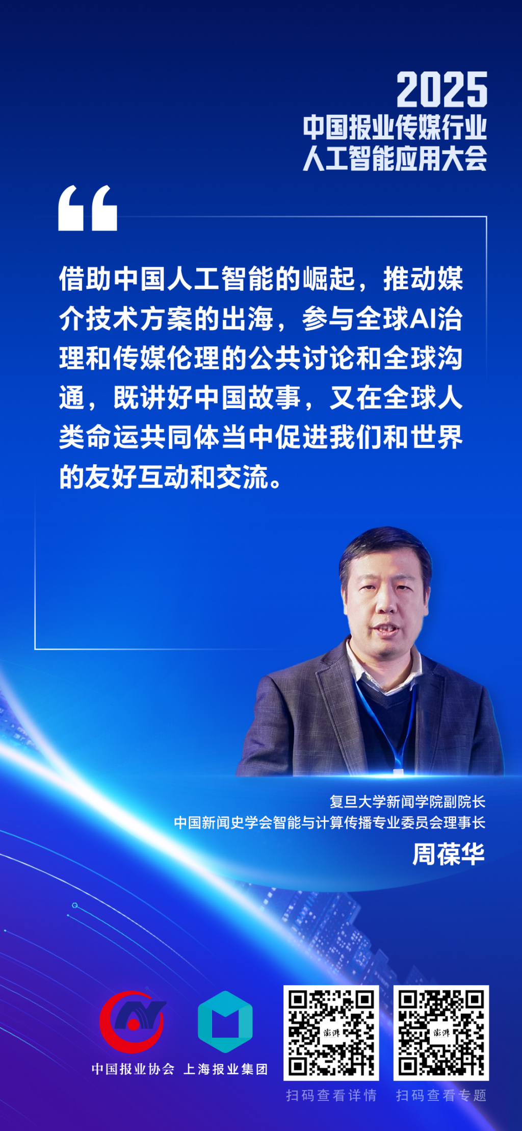 11月28日下午,在上海举行的中国报业传媒行业人工智能应用大会上,由复旦大学计算与智能传播研究中心与澎湃新闻联合编制的 《2025中国报业传媒行业AI融媒应用蓝皮书》(以下简称“蓝皮书”)发布,这是国内首份AI融媒应用《蓝皮书》。复旦大学新闻学院副院长、中国新闻史学会智能与计算传播专业委员会理事长周葆华教授介绍了具体内容。