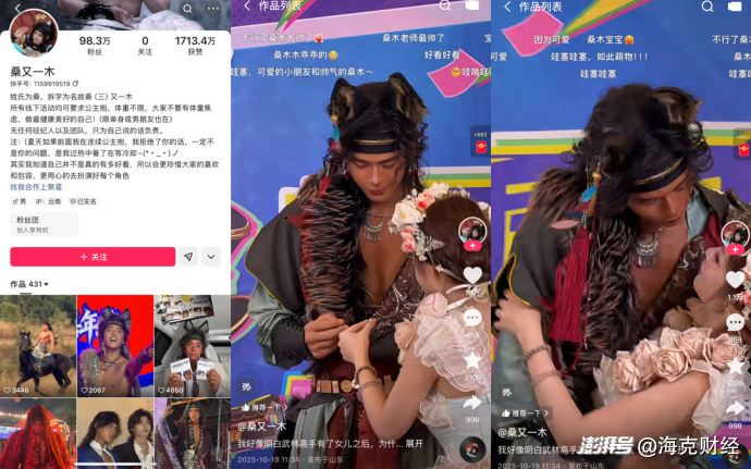 比如凭借黑皮兽耳造型与小奶狗长相迅速出圈的桑木,账号名为“桑又一木”,目前在抖音已拥有176.8万粉丝,在快手已拥有98.3万粉丝。桑木账号还特别标注,线下互动均可进行“公主抱”,体重不限。桑木通过可触碰的真人体验满足用户需求,火了以后,活动也从原先郑州方特欢乐世界的定点演出,拓展至全国多个城市的线下活动。