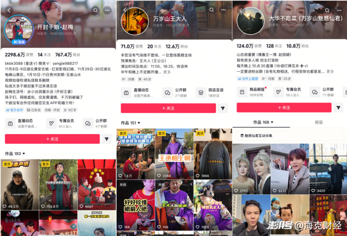 在此背景下,不少万岁山的NPC走红出圈。比如“王婆说媒”,节目被网友戏称为“接地气版《非诚勿扰》”,“王婆”的扮演者赵梅也由此深得网友喜爱。目前赵梅的账号在抖音已拥有767.4万粉丝,在快手已拥有172.8万粉丝。万岁山还有扮演过丞相及公公形象的“万岁山王大人”、扮演仙君的“大华不吃菜”等,他们的短视频平台账号粉丝量多在10万以上。