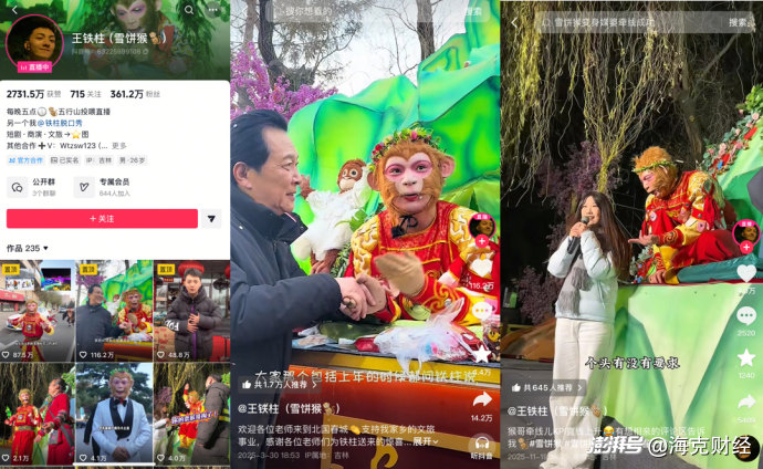 长春市动植物公园昵称“雪饼猴”的孙悟空NPC即是典型一例。目前“雪饼猴”扮演者王铁柱在抖音已拥有361.2万粉丝,在快手已拥有35.2万粉丝。除本人账号外,短视频平台上还有大量分享“雪饼猴”视频切片的账号,部分账号的累计点赞量超过了600万。