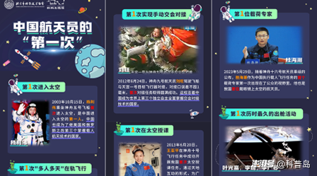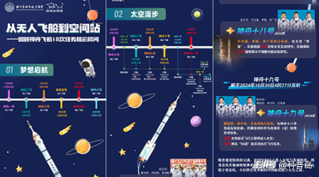 除图文外,还推出11套精心设计的彩色长图,如《从无人飞船到空间站——回顾神舟飞船18次任务精彩瞬间》、《中国空间站进化简史》、《中国航天员的“第一次”》等,以更直观的方式梳理了中国航天的辉煌历程与关键知识点。