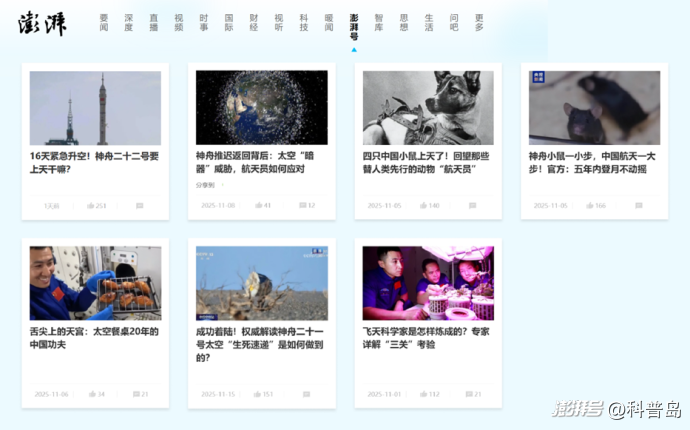 除了硬核的技术解读,蝌蚪五线谱还注重挖掘航天任务中的人文与历史脉络。借神舟二十一号搭载小鼠上行之机,平台梳理了人类航天史上著名的“动物航天员”,推出一篇《四只中国小鼠上天了,回望那些替人类先行的动物“航天员”》。结合我国首台“太空烤箱”的使用,又推出一篇《舌尖上的天宫:太空餐桌20年的中国功夫》,回顾了中国航天员食品的演进历程,让宏大叙事更具温度。