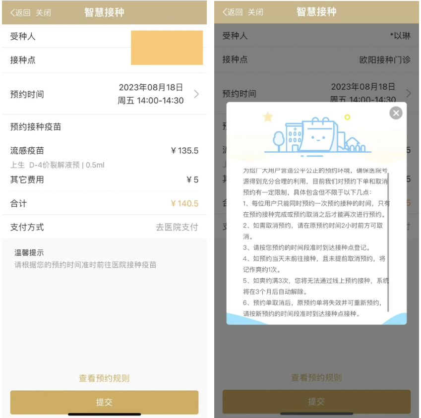 第四步:确认受种人、预约信息,并在阅读预约规则后,提交预约订单。