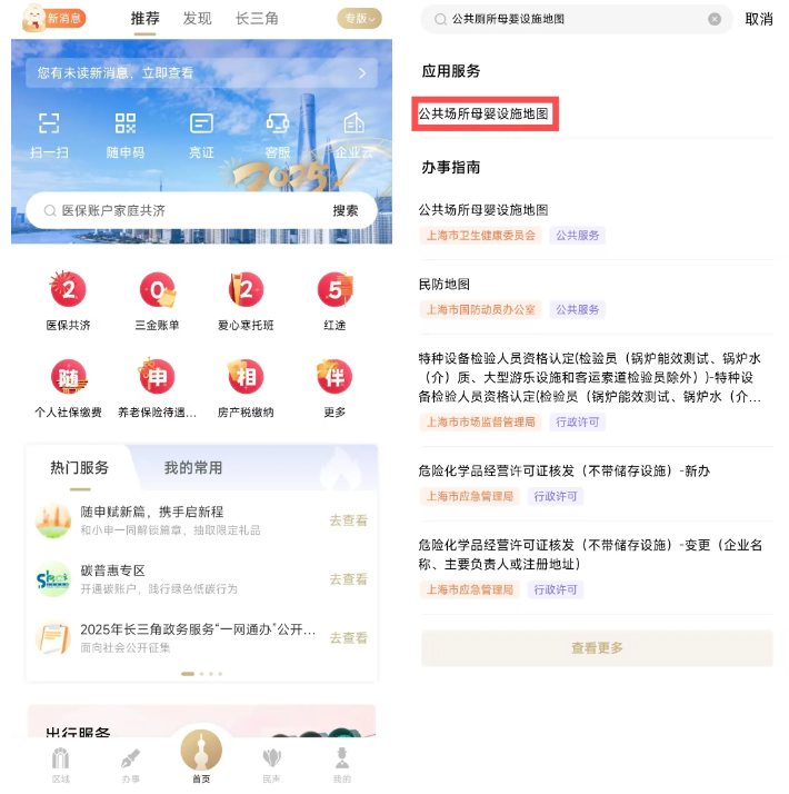 打开“随申办市民云”APP首页搜索“公共场所母婴设施地图”,点击进入。
