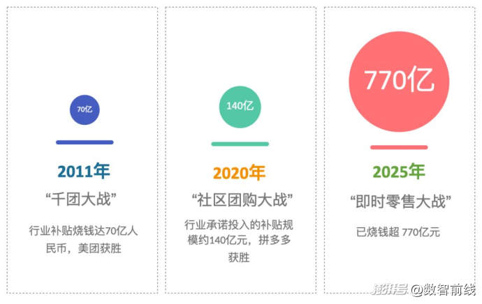 2011年,第一次 “千团大战”,行业补贴烧钱为70亿元,美团获胜。2020年,第二次“社区团购大战”,行业承诺投入的补贴规模约140亿元,拼多多获胜;2025年,“即时零售大战”,已烧钱超770亿元,且补贴规模仍在扩大。而此前的共享单车大战,烧钱为280亿元左右。