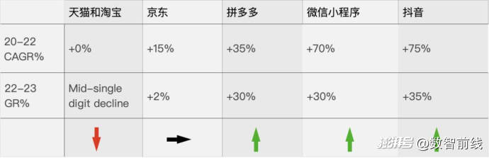 奥纬咨询针对主要渠道商品交易总额 (GMV) 演变的统计显示,从2020年开始,淘宝天猫与京东增长已开始减缓甚至进入负增长,而抖音电商、拼多多在以30%高度增长,如果任由该趋势持续,有推算认为,2027年抖音电商或将反超阿里。