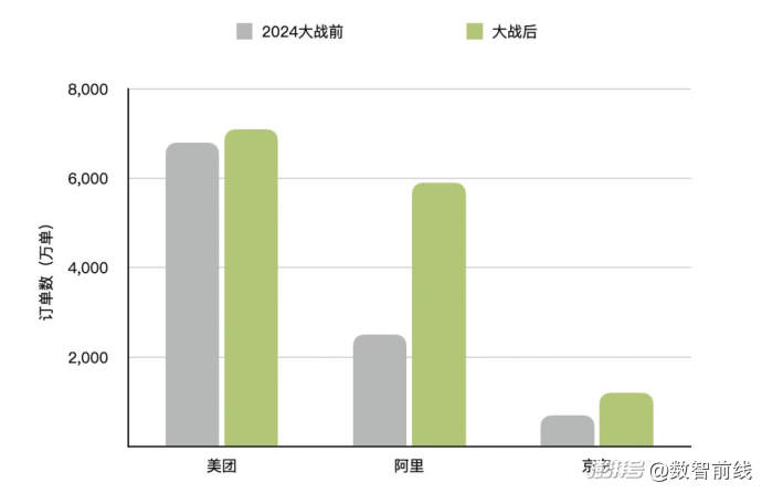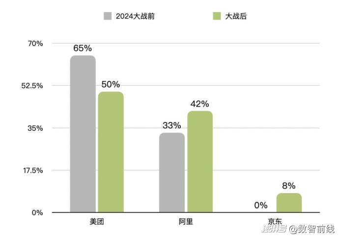 这场即时零售大战经历数月争夺后,不同机构给出了大战前后各家的市占率变化。交银国际研报显示,在大战前的2024年,美团外卖占据65%的市场份额,饿了么33%,其他小型平台合计仅占 2%;另有行业分析提及,美团份额稳定在70%左右,饿了么约为 30%。