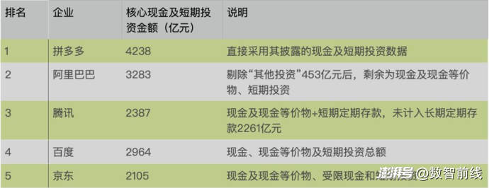 中国互联网企业“现金王”(包括核心现金及短期投资金额)排名发生变化,拼多多替代阿里,从第二位升至第一位: