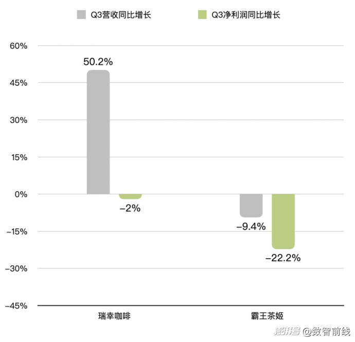 而霸王茶姬定位高端茶饮,均价在18元左右,为保持品牌调性,未参与这次大战,在这场薅羊毛大战中被分流,Q3营收和利润同比双双下降,其中营收32.08亿元,下降9.4%,经调整后净利润5.03 亿元,下降 22.2%。