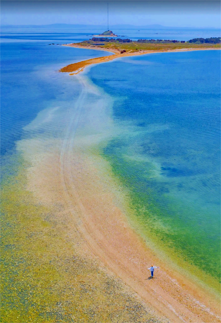拖尾长沙是大黑山岛的另一处奇景。退潮时,海面会显现出一条蜿蜒曲折的小路,仿佛延伸到世界的尽头,两侧是清澈见底的海水,鹅卵石铺就的路径晶莹剔透,让人仿佛踏入了童话世界。