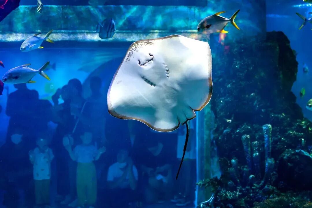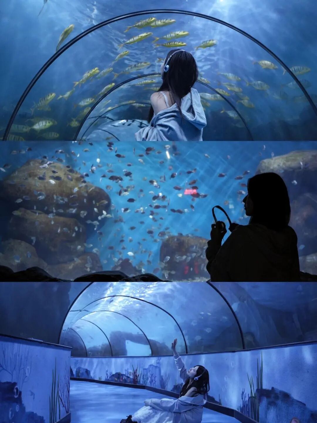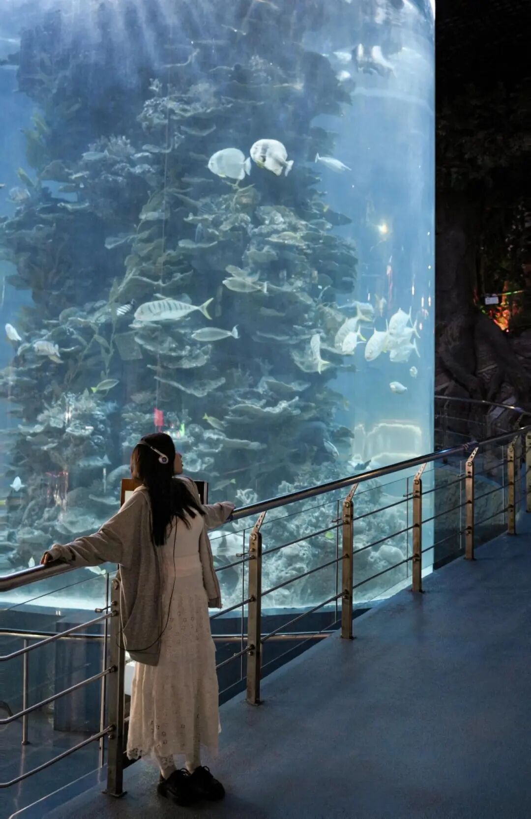 进入海底隧道,鲸鲨从头顶优雅游过,鳐鱼展开双翼如海中飞鸟,成千上万的热带鱼组成流动的彩虹,仿佛进入了一个蓝色的梦幻世界