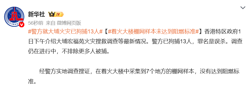此前据新华社消息,香港特区政府1日下午介绍大埔宏福苑火灾搜救调查等最新情况。警方已拘捕13人,罪名是误杀。调查仍在进行中,不排除更多人被捕。